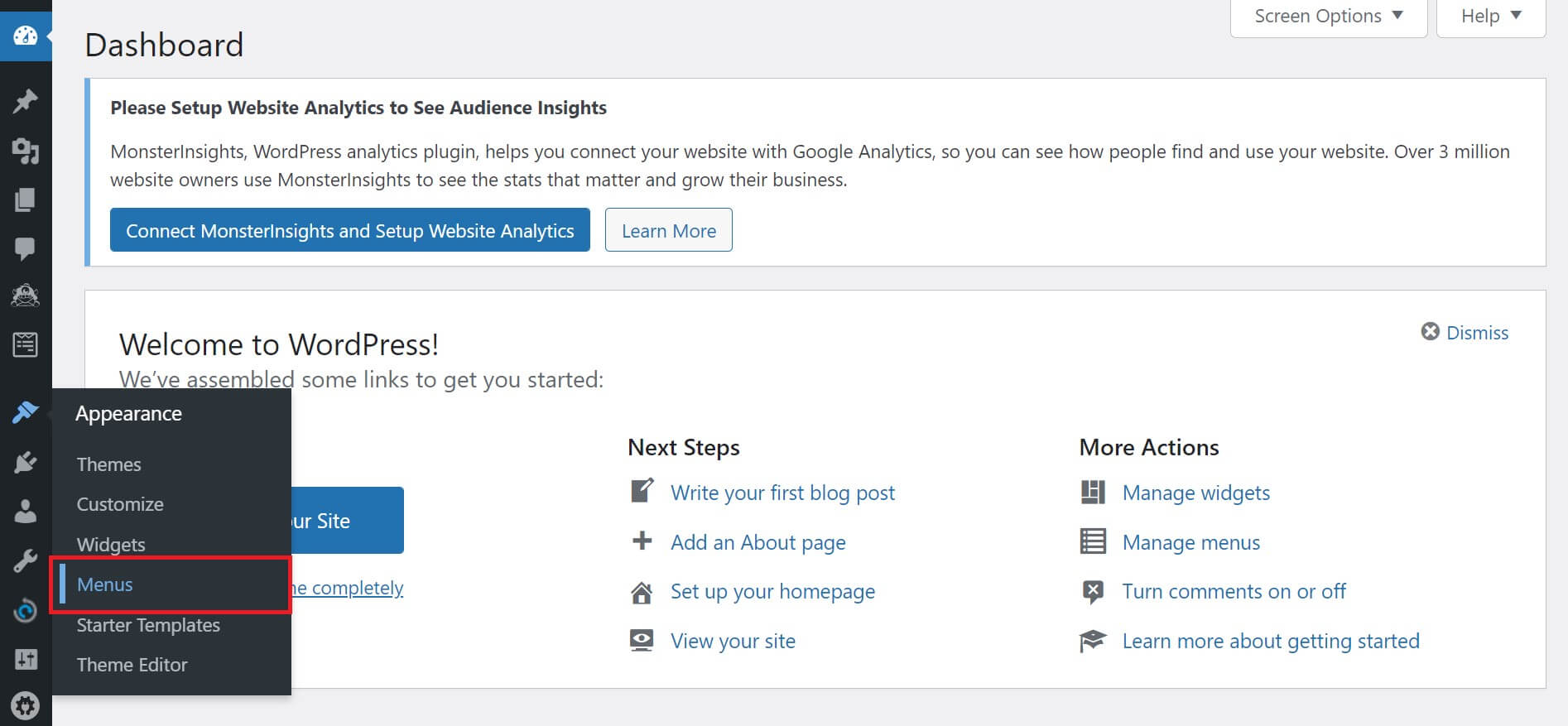 - Go to your WordPress Admin. Then, navigate to Appearance -> Menus.