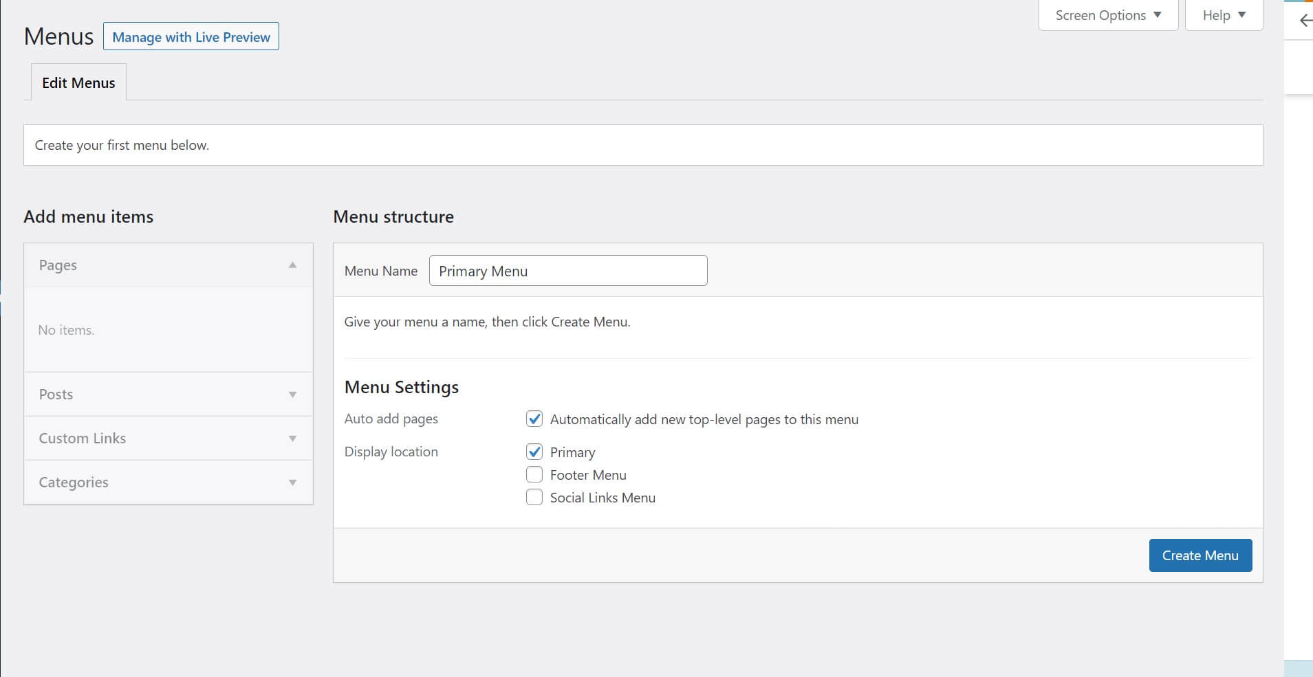 - Create a new menu, naming it Primary Menu, for example. Then, on Menu Settings, check the options Automatically add new top-level pages to this menu and Primary.