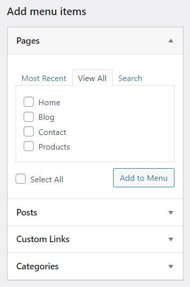 That being said, you’ll need to add them manually if they are not available in the Menu structure tab. Click the View All tab and check each page or Select All on the Pages column. Then, click Add to Menu to confirm the changes.