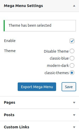 - Navigate to Appearance -> Menus. On the Mega Menu Settings page, check Enable and select a theme. Click Save.