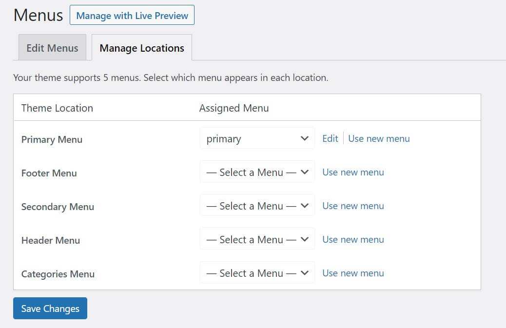 In this example, WordPress will generate two menus on the Manage Locations tab: Header Menu and Categories Menu.