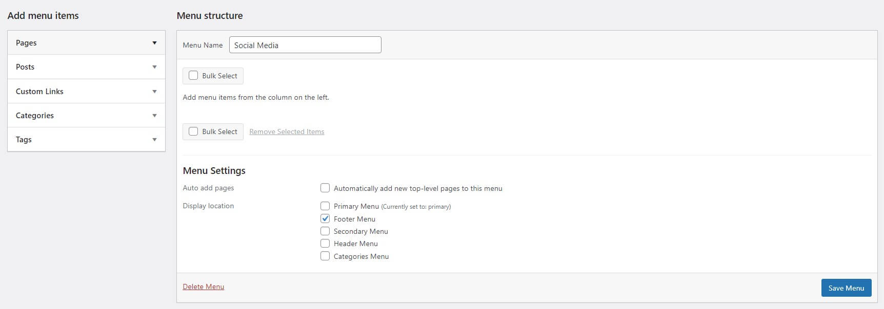 - Remember to check the Display location where the menu should appear. In this example, we’ll choose the footer.