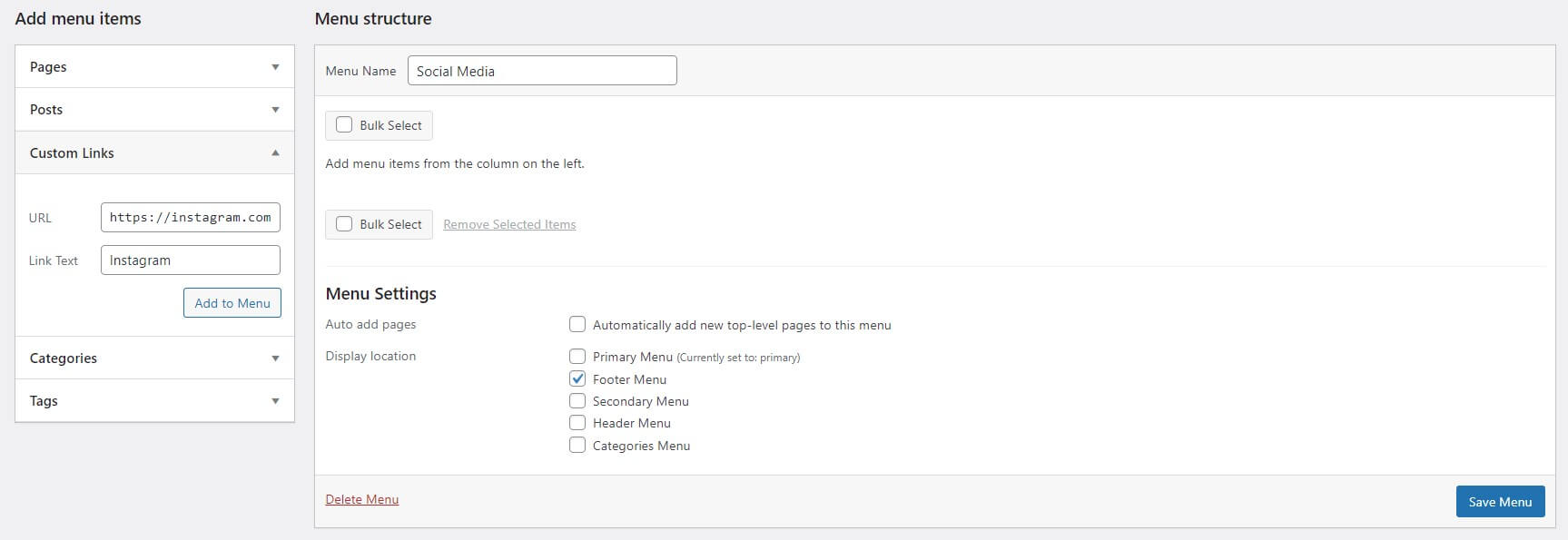 - After that, navigate to Add menu items -> Custom Links. Here, you can add your social media accounts, such as https://instagram.com/myblog/, and the link text. Click Add Menu to add the custom link and save.