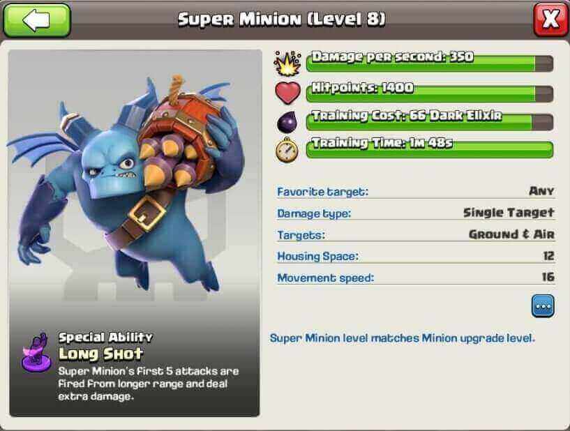 The increased attack range makes the Super Minion probably one of the best units for clearing certain buildings at the beginning of an attack, in order to prepare the correct approach or to destroy a certain defense so that it does not annoy during the attack.